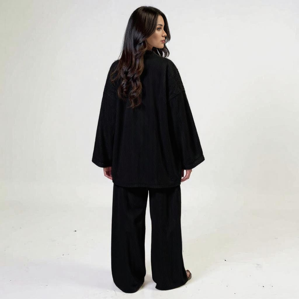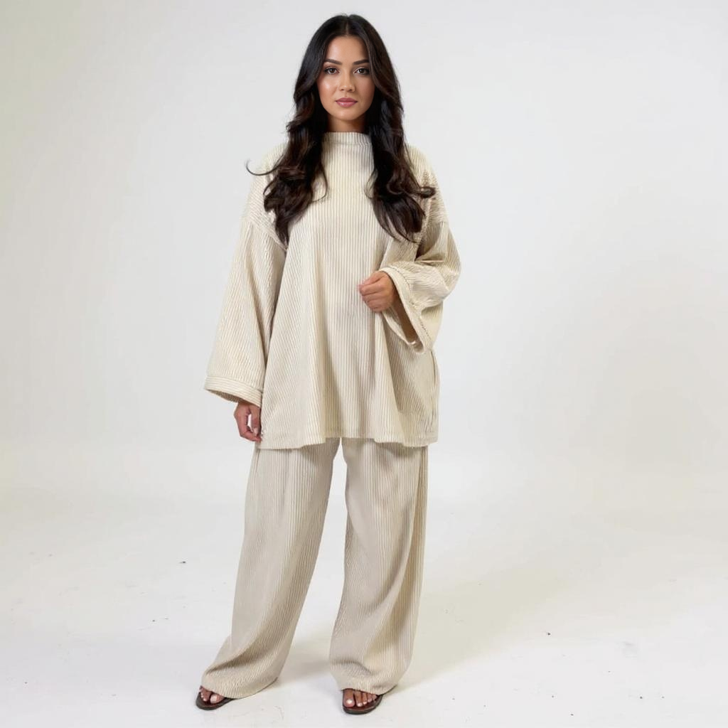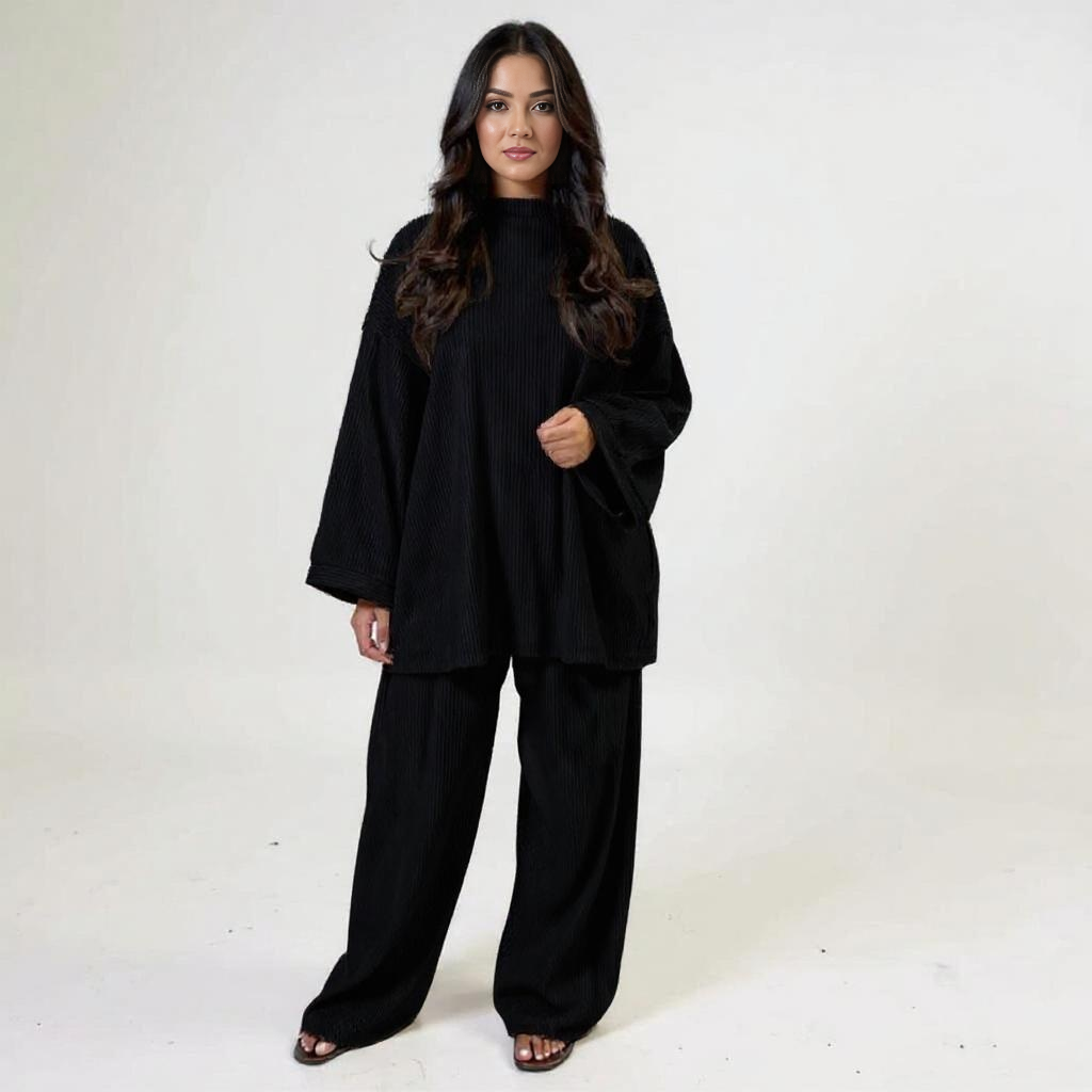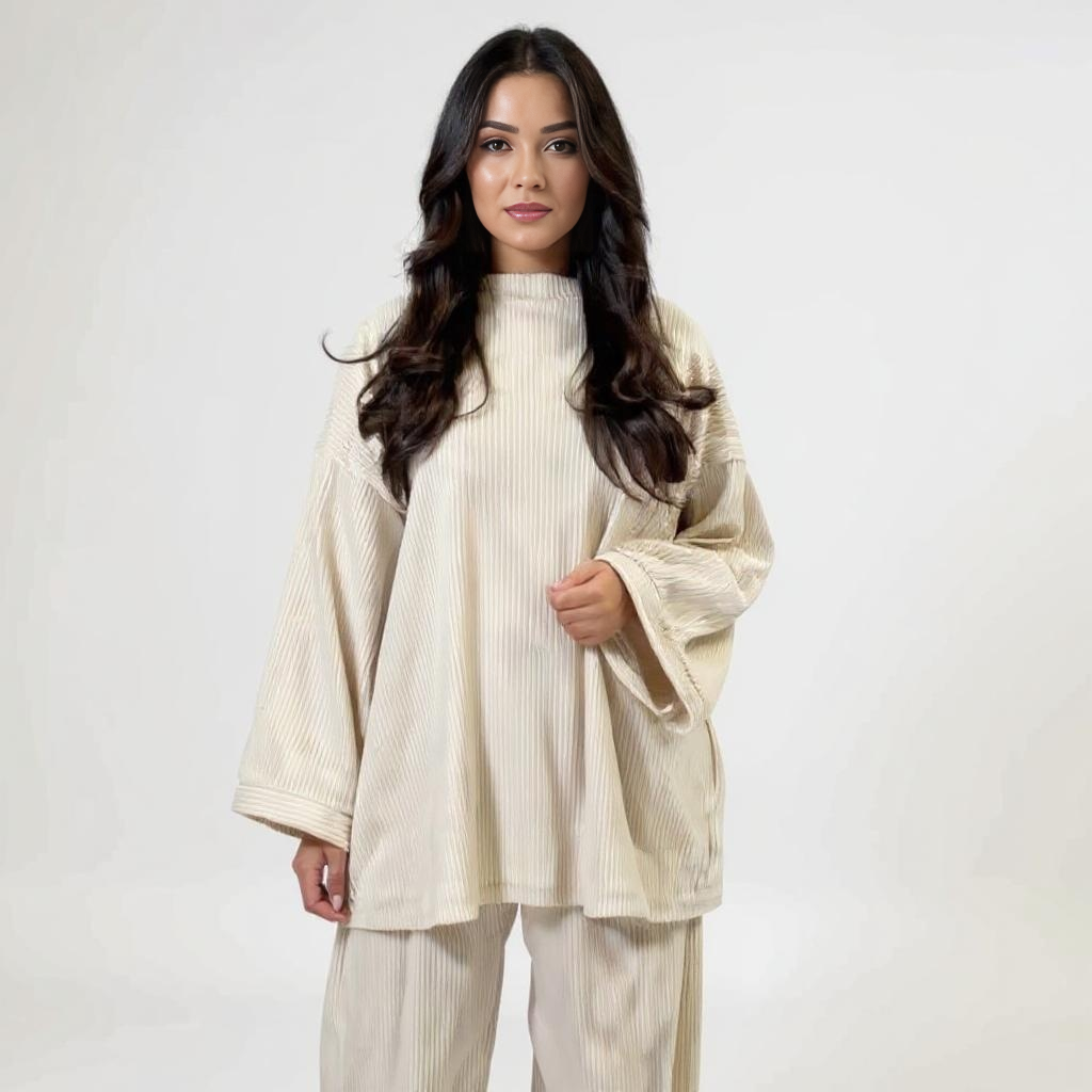 Połączenie luźnej bluzki z prostymi rękawami i dopasowanych spodni z wygodnym pasem zapewnia równowagę między swobodą ruchów a spokojnym, stylowym wyglądem.